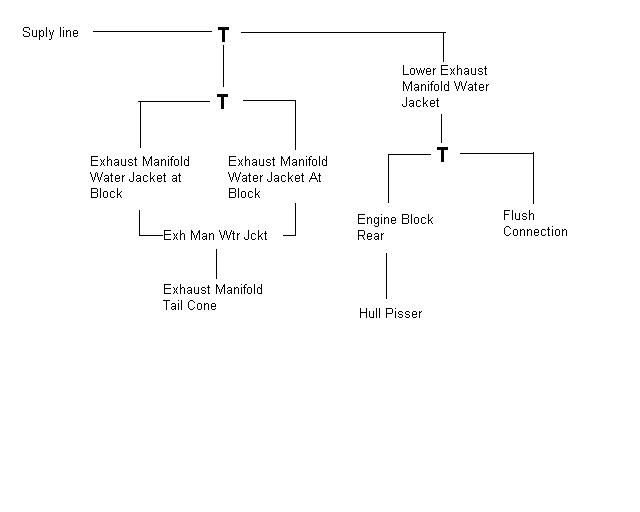From the first 'T' that goes to the bottom of the exhaust, water travels through the exhaust pipe water jacket and goes exits up about 8" into a line that goes to the rear of the block/cylinder head. There is a 'T' in this line that goes to the flush hose.