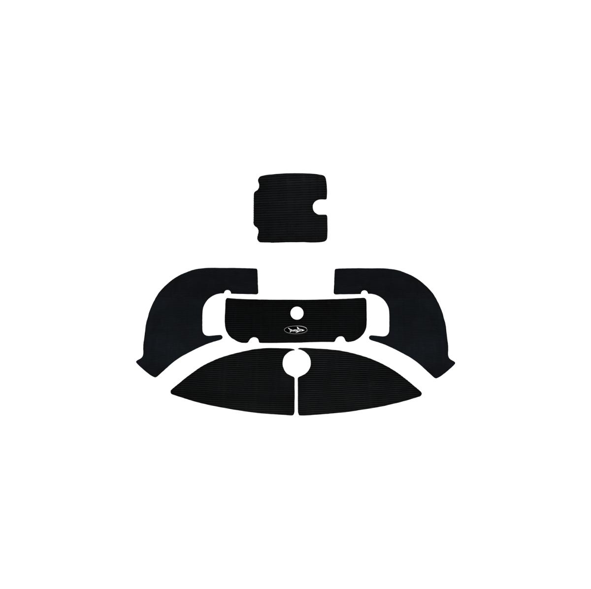 Option 1)Removal of snaps from old carpet inserts: This applies to boats that have previously had snap in cockpit carpeting. You will first need to remove all the existing snaps. These are normally screwed down with a stainless steel Phillips head screw. Once the screws are removed we suggest filling the holes with epoxy to prevent water intrusion. You can use any of the quick set epoxies available at marine parts store, auto parts store and home centers. We suggest the syringe type that pre mixes as it comes out, it is a little easier to apply. Option 2)Removal of previously glued down traction mats: Start by peeling a corner of the mat up from the deck. Slowly continue to pull while using a plastic putty knife or scraper to help you release the mat from the glue. Keep working at it until all mats are removed. Once the mats are removed you need to get the left over pieces and the remaining glue residue. We suggest 3M adhesive remover or other suitable brand. This will soften the glue and allow you to scrap and wipe it away. Clean up:? After all the old mats and glue are removed you will need to clean the surface before installing your new mat set.? Use some rags and solvent for this step. Denatured alcohol, acetone, goof off or goo gone will work here. Change your rag often so as not to just spread the dirt and goo around. After this wash the entire surface with a mild soap and water solution and thoroughly dry ( a day in the sun works best here). Install: First lay out all the mats in their proper location and check for a good fit. At this point use a pencil and mark a few spots around each mat to use as an alignment guide while sticking them down. Begin by peeling one edge of the first mat you have chosen to install and stick it to the floor making sure to align it with your marks. Once this edge is down you can continue to peel the backing while pressing the mat into place.(DO NOT TRY TO INSTALL THE ENTIRE MAT AT ONCE) After all mats are adhered to the floor of the boat you must apply pressure over the entire surface to activate the PSA (pressure sensitive adhesive). You can do this by standing on all the mats moving around to make sure you apply pressure everywhere, especially the edges. Care and Maintenance: BlackTip Jetsports Traction Mats are very easy to care for. Rinse them with fresh water while cleaning the boat. Use a mild soap and water solution the same as you would for washing the rest of the boat. For stubborn stains you can use Simple Green, Fantastic, 409 or other similar household cleaner and rinse with water after cleaning. |