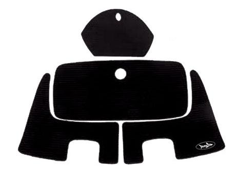 Option 1)Removal of snaps from old carpet inserts: This applies to boats that have previously had snap in cockpit carpeting. You will first need to remove all the existing snaps. These are normally screwed down with a stainless steel Phillips head screw. Once the screws are removed we suggest filling the holes with epoxy to prevent water intrusion. You can use any of the quick set epoxies available at marine parts store, auto parts store and home centers. We suggest the syringe type that pre mixes as it comes out, it is a little easier to apply. Option 2)Removal of previously glued down traction mats: Start by peeling a corner of the mat up from the deck. Slowly continue to pull while using a plastic putty knife or scraper to help you release the mat from the glue. Keep working at it until all mats are removed. Once the mats are removed you need to get the left over pieces and the remaining glue residue. We suggest 3M adhesive remover or other suitable brand. This will soften the glue and allow you to scrap and wipe it away. Clean up:? After all the old mats and glue are removed you will need to clean the surface before installing your new mat set.? Use some rags and solvent for this step. Denatured alcohol, acetone, goof off or goo gone will work here. Change your rag often so as not to just spread the dirt and goo around. After this wash the entire surface with a mild soap and water solution and thoroughly dry ( a day in the sun works best here). Install: First lay out all the mats in their proper location and check for a good fit. At this point use a pencil and mark a few spots around each mat to use as an alignment guide while sticking them down. Begin by peeling one edge of the first mat you have chosen to install and stick it to the floor making sure to align it with your marks. Once this edge is down you can continue to peel the backing while pressing the mat into place.(DO NOT TRY TO INSTALL THE ENTIRE MAT AT ONCE) After all mats are adhered to the floor of the boat you must apply pressure over the entire surface to activate the PSA (pressure sensitive adhesive). You can do this by standing on all the mats moving around to make sure you apply pressure everywhere, especially the edges. Care and Maintenance: BlackTip Jetsports Traction Mats are very easy to care for. Rinse them with fresh water while cleaning the boat. Use a mild soap and water solution the same as you would for washing the rest of the boat. For stubborn stains you can use Simple Green, Fantastic, 409 or other similar household cleaner and rinse with water after cleaning. |