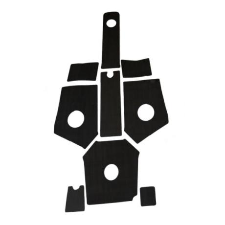 Option 1)Removal of snaps from old carpet inserts: This applies to boats that have previously had snap in cockpit carpeting. You will first need to remove all the existing snaps. These are normally screwed down with a stainless steel Phillips head screw. Once the screws are removed we suggest filling the holes with epoxy to prevent water intrusion. You can use any of the quick set epoxies available at marine parts store, auto parts store and home centers. We suggest the syringe type that pre mixes as it comes out, it is a little easier to apply. Option 2)Removal of previously glued down traction mats: Start by peeling a corner of the mat up from the deck. Slowly continue to pull while using a plastic putty knife or scraper to help you release the mat from the glue. Keep working at it until all mats are removed. Once the mats are removed you need to get the left over pieces and the remaining glue residue. We suggest 3M adhesive remover or other suitable brand. This will soften the glue and allow you to scrap and wipe it away. Clean up:? After all the old mats and glue are removed you will need to clean the surface before installing your new mat set.? Use some rags and solvent for this step. Denatured alcohol, acetone, goof off or goo gone will work here. Change your rag often so as not to just spread the dirt and goo around. After this wash the entire surface with a mild soap and water solution and thoroughly dry ( a day in the sun works best here). Install: First lay out all the mats in their proper location and check for a good fit. At this point use a pencil and mark a few spots around each mat to use as an alignment guide while sticking them down. Begin by peeling one edge of the first mat you have chosen to install and stick it to the floor making sure to align it with your marks. Once this edge is down you can continue to peel the backing while pressing the mat into place.(DO NOT TRY TO INSTALL THE ENTIRE MAT AT ONCE) After all mats are adhered to the floor of the boat you must apply pressure over the entire surface to activate the PSA (pressure sensitive adhesive). You can do this by standing on all the mats moving around to make sure you apply pressure everywhere, especially the edges. Care and Maintenance: BlackTip Jetsports Traction Mats are very easy to care for. Rinse them with fresh water while cleaning the boat. Use a mild soap and water solution the same as you would for washing the rest of the boat. For stubborn stains you can use Simple Green, Fantastic, 409 or other similar household cleaner and rinse with water after cleaning. |