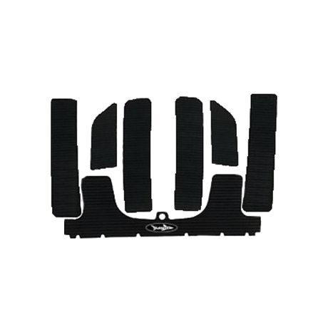 Removal of original riveted mats :Drill the heads off of the rivets holding down the original mats while pushing the remaining rivet into the hull. Fill the holes left by the rivet with 5min. epoxy, this can be purchased locally at any auto parts store. Make sure to scrape the epoxy flat in the foot wells so the new mats will lay flush. Clean the area that the new mats will be attached to with acetone solvent for proper adhesion. Removal of original glue down mats:By hand, peel off any old mat material that you are able to and then you use a putty knife to help remove all material from the difficult areas. Areas that are difficult may require spraying WD-40 brand lubricant in between the mat and hull to help loosen the old adhesive. Take your time on the prep work; this is important to achieve professional results. Now that your surface is clean and ready for the new mats it is time to lay out how your mats will look in the foot wells. This is the location the mats will be attached. Trace around the mats using a pencil. This is your reference area to place the mats after the paper is peeled off the back of the mat. Peel off the paper backing from the mat and line up one end of the mat to your traced out area. (Do Not Try to Install the complete mat in one shot) Slowly work the mat down into your outline. After the entire mat is installed you must apply even pressure down on top of the mat to insure complete contact to the hull. Let mats sit for 12 hrs after the install so the glue will fully cure. |