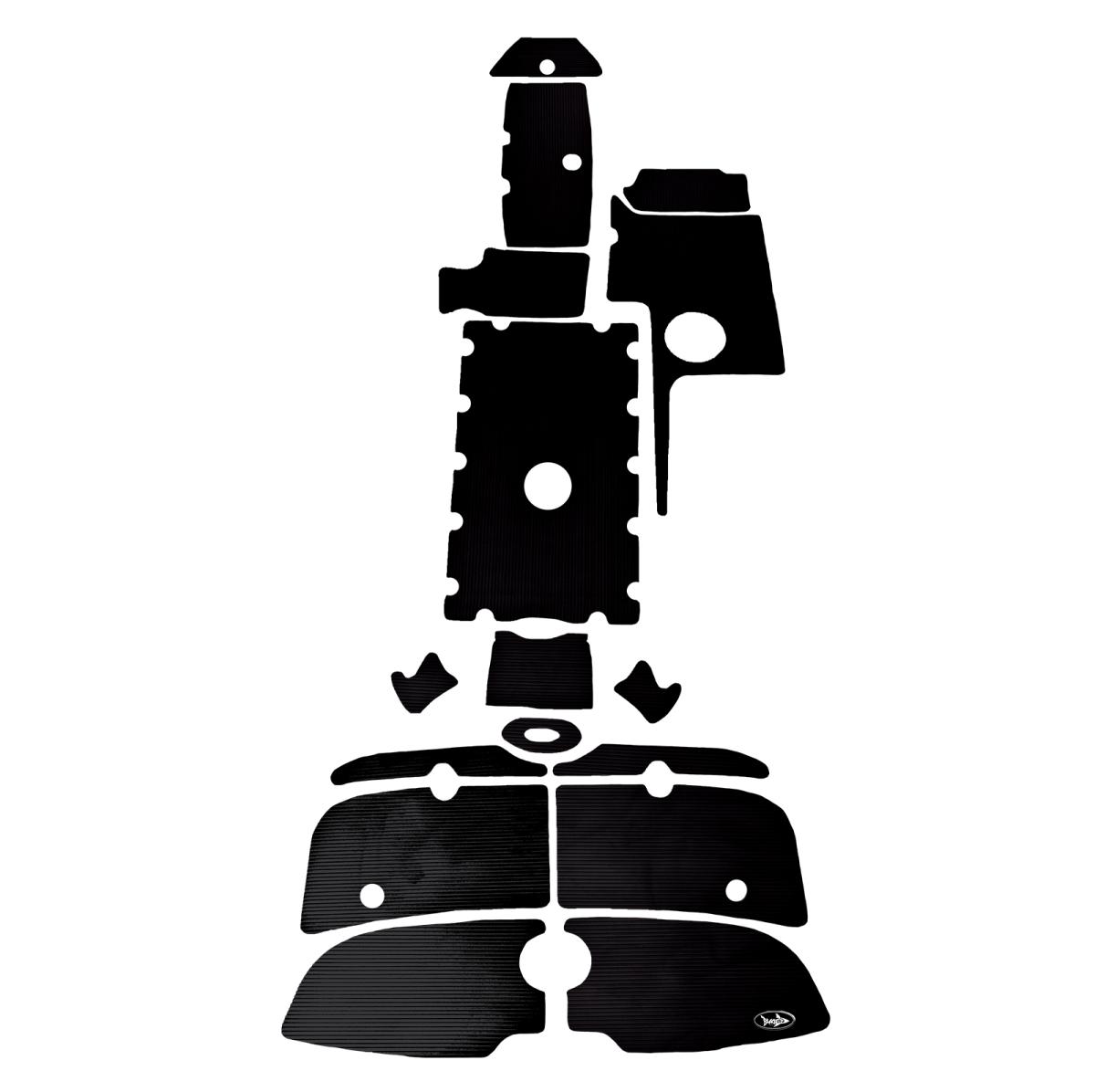Option 1)Removal of snaps from old carpet inserts: This applies to boats that have previously had snap in cockpit carpeting. You will first need to remove all the existing snaps. These are normally screwed down with a stainless steel Phillips head screw. Once the screws are removed we suggest filling the holes with epoxy to prevent water intrusion. You can use any of the quick set epoxies available at marine parts store, auto parts store and home centers. We suggest the syringe type that pre mixes as it comes out, it is a little easier to apply. Option 2)Removal of previously glued down traction mats: Start by peeling a corner of the mat up from the deck. Slowly continue to pull while using a plastic putty knife or scraper to help you release the mat from the glue. Keep working at it until all mats are removed. Once the mats are removed you need to get the left over pieces and the remaining glue residue. We suggest 3M adhesive remover or other suitable brand. This will soften the glue and allow you to scrap and wipe it away. Clean up:? After all the old mats and glue are removed you will need to clean the surface before installing your new mat set.? Use some rags and solvent for this step. Denatured alcohol, acetone, goof off or goo gone will work here. Change your rag often so as not to just spread the dirt and goo around. After this wash the entire surface with a mild soap and water solution and thoroughly dry ( a day in the sun works best here). Install: First lay out all the mats in their proper location and check for a good fit. At this point use a pencil and mark a few spots around each mat to use as an alignment guide while sticking them down. Begin by peeling one edge of the first mat you have chosen to install and stick it to the floor making sure to align it with your marks. Once this edge is down you can continue to peel the backing while pressing the mat into place.(DO NOT TRY TO INSTALL THE ENTIRE MAT AT ONCE) After all mats are adhered to the floor of the boat you must apply pressure over the entire surface to activate the PSA (pressure sensitive adhesive). You can do this by standing on all the mats moving around to make sure you apply pressure everywhere, especially the edges. Care and Maintenance: BlackTip Jetsports Traction Mats are very easy to care for. Rinse them with fresh water while cleaning the boat. Use a mild soap and water solution the same as you would for washing the rest of the boat. For stubborn stains you can use Simple Green, Fantastic, 409 or other similar household cleaner and rinse with water after cleaning. |